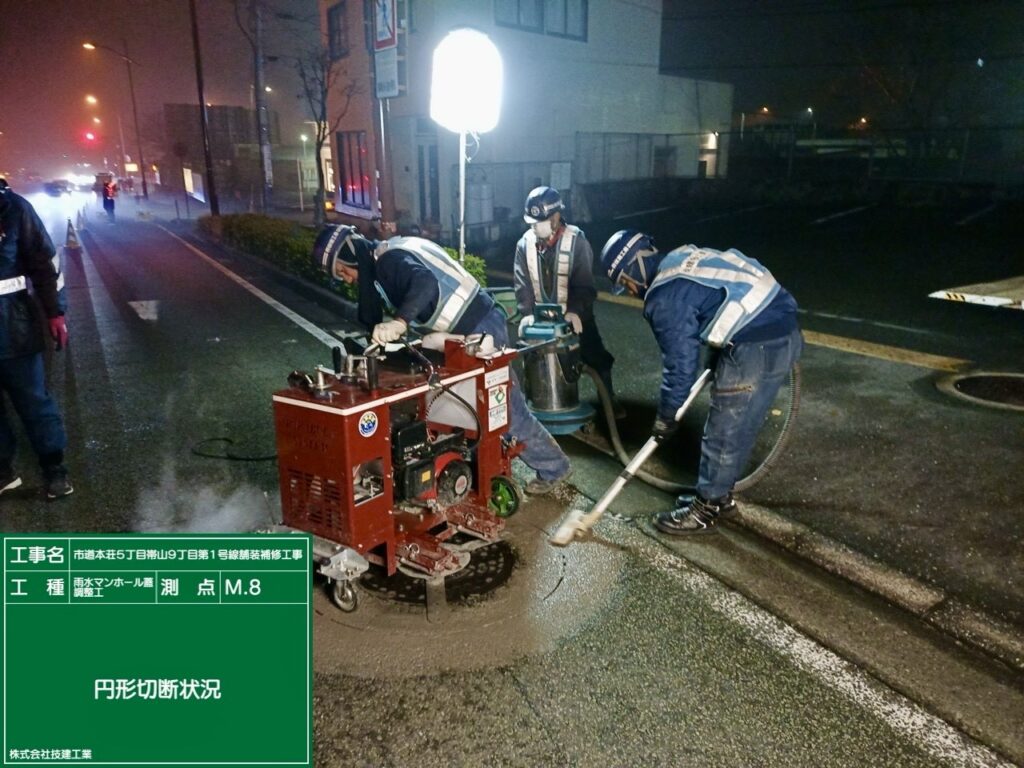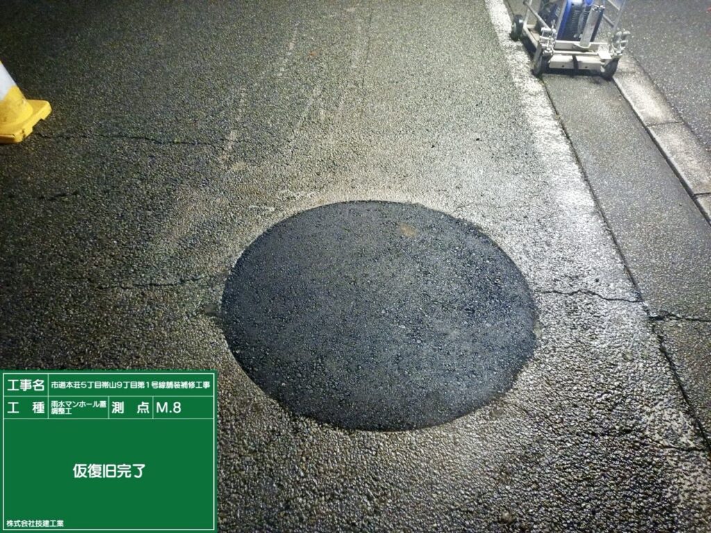 今週は来週の舗装工事に向け、工事に支障のある高さのあるマンホール蓋を道路下に埋込、舗装を削り取る作業がスムーズに進むように準備を行いました。